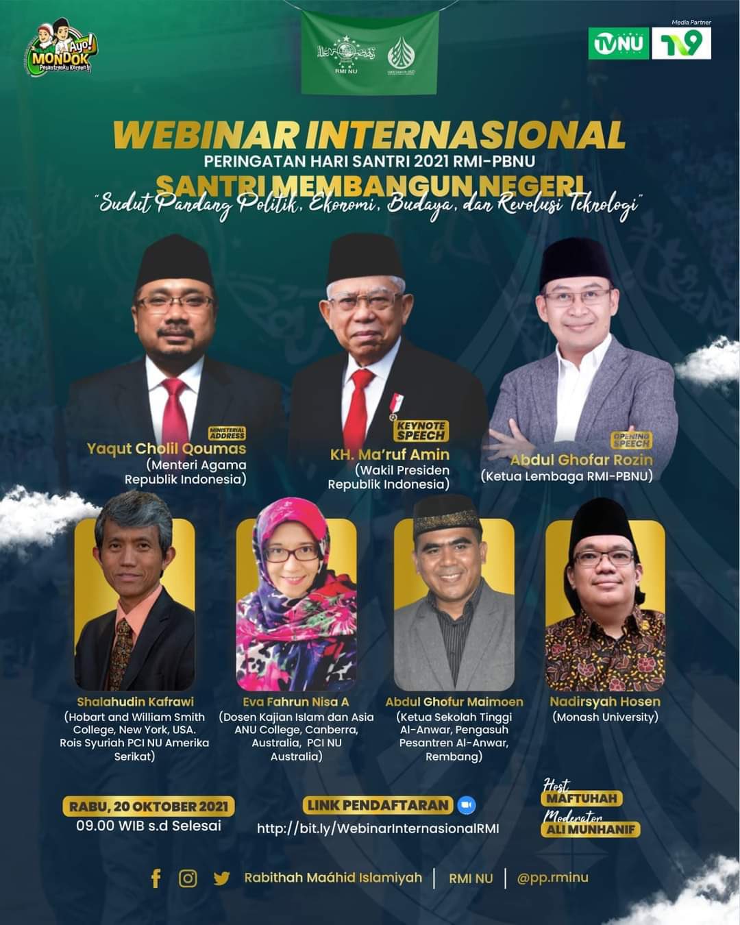 JAKARTA, Suaranahdliyin.com – Rabithah Ma’ahid Islamiyah (RMI) Nahdlatul Ulama (NU) akan menyelenggarakan webinar internasional “Santri Membangun Negeri” dalam perspektif politik, ekonomi, budaya, dan revolusi teknologi, Rabu (20/10/2021).