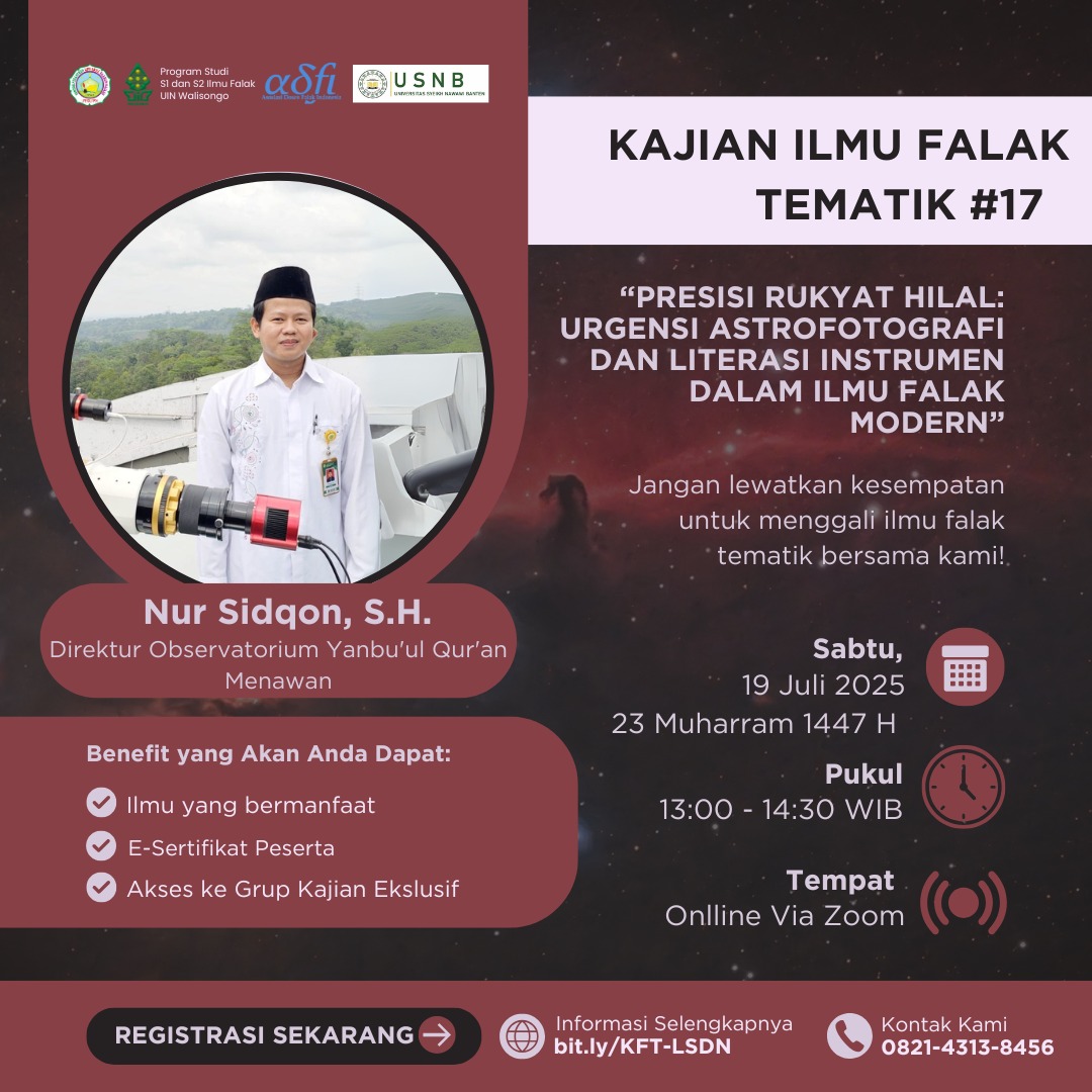 Acara yang akan dilangsungkan mulai pukul 13.00 hingga 14.30 WIB ini, terbuka untuk umum, baik mahasiswa, akademisi, praktisi dan siapa saja yang ingin memperdalam ilmu falak dan astronomi.