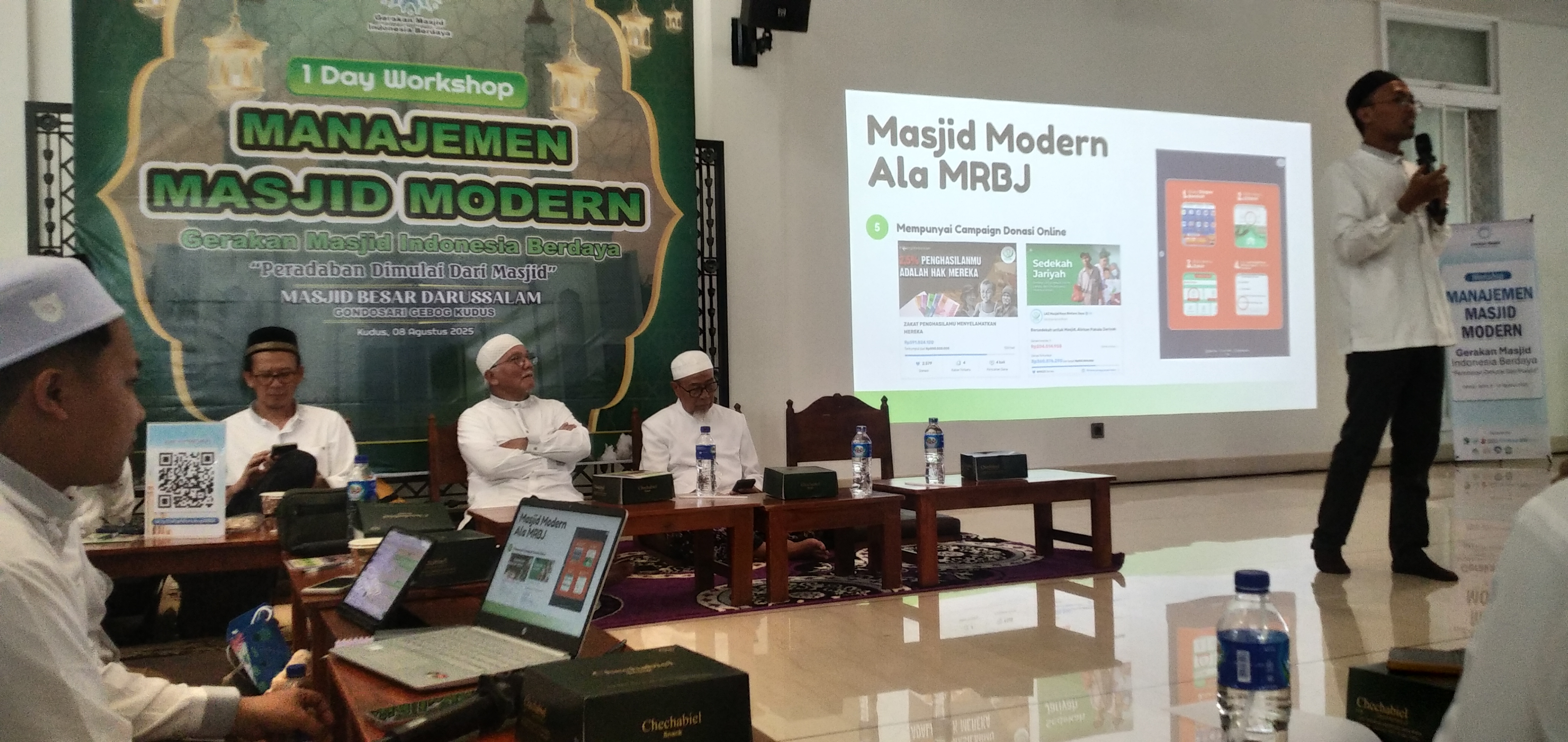 Hal ini mengemuka dalam workshop pengelolaan Manajemen masjid modern di Masjid Besar Darussalam Gondosari Gebog Kudus Jum’at (8/8/2025). Workshop yang diikuti 80 utusan masjid menghadirkan pembicara dari tim Masjid Besar Bintaro Jaya (MRBJ).Tangerang Selatan Banten.