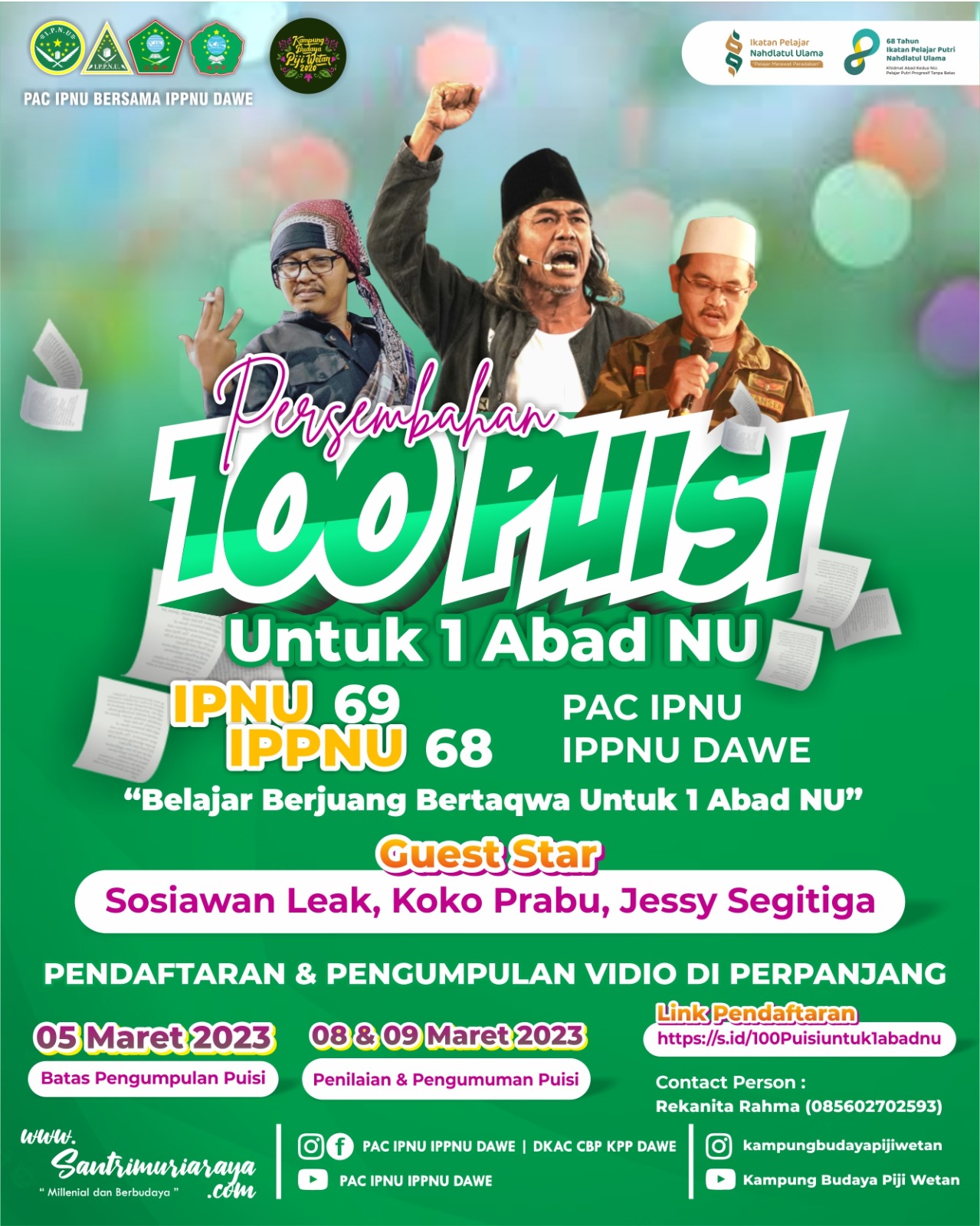 KUDUS, Suaranahdliyin.com – Sayembara 100 puisi untuk 1 Abad NU masih dibuka untuk masyarakat umum se-Kabupaten Kudus. Adapun sistem pendaftaran yakni peserta mengirim vidio baca puisi dengan puisi karya sendiri.